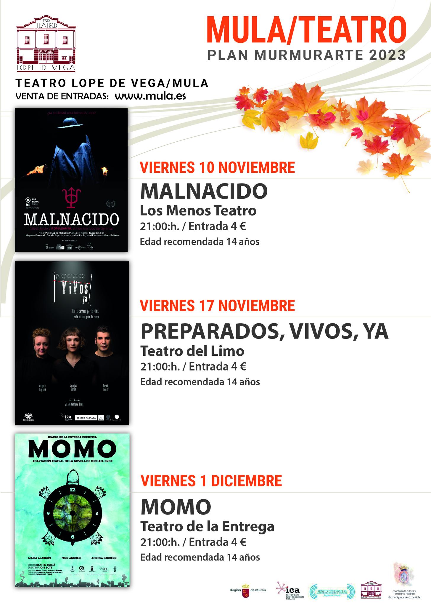 TEATRO ¡ENTRADAS ANTICIPADAS A LA VENTA!Venta anticipada: https://mula.es/web/cultura-y-festejos/cine/Cultura. 10 de noviembre. MALNACIDO. 21 horas. 4 eurosCultura. 17 de noviembre. PREPARADOS, VIVOS, YA. 21 horas. 4 eurosCultura. 1 de diciembre. MOMO. 21 horas. 4 eurosMujer e Igualdad. 9 de diciembre. ANSELMA & LUISA. 21 horas. 3 euros