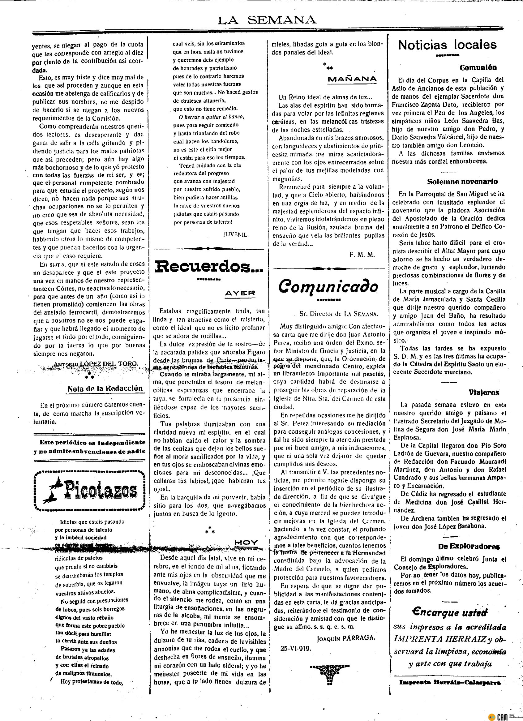 Periodico de Mula La Semana nº21 4 de Julio de 1919 Periodico Muleño,La SemanaArtículo AnteriorPeriodico de Mula La Semana nº22 11 de Julio de 1919Artículo SiguientePeriodico de Mula La Semana nº20 20 de Julio de 1919-ESPECIALTipografíaMás PequeñaPequeñaMedianaGrandeMás GrandePredeterminadaHelveticaSegoeGeorgiaTimesModo LecturaCompartirArtículo AnteriorPeriodico de Mula La Semana nº22 11 de Julio de 1919Artículo SiguientePeriodico de Mula La Semana nº20 20 de Julio de 1919-ESPECIAL