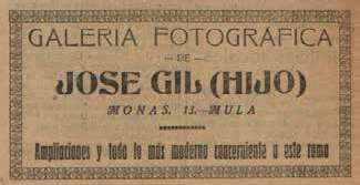 Los negocios del polifacético manco prosperan. Es el único fotógrafo de la ciudad, tampoco hay más relojeros y el tabaco se consume con alegría. Es entonces cuando la familia adquiere un inmueble en propiedad en el número 13 de la calle de las Monas (El Noticiero de Mula, 27-IX-1891) Allí establecen la residencia familiar José aprovecha las cámaras altas de la casa para establecer el estudio de fotografía. Hace una buena inversión adecuando una parte de la cubierta con cristal para dejar el paso de la luz del día, con lo que consigue un ambiente 'propicio para realizar las fotografías (González Castaño, 2020) Allí continuó al frente del estudio Gil Candel, hasta que tomó el relevo José, su hijo mayor: Esto debió de ser entre 1914, que el padre consta como fotógrafo en el censo electoral, y 1917 cuando se publicita por primera vez el estudio familiar como Galería fotográfica. José Gil (hijo)w (Heraldo de Mula, 04-VII-1917) (Figura 4). En 1924, José (hijo) es nombrado oficial interino de quintas en el Ayuntamiento de Mula. Al parecer, continuó durante un tiempo con el estudio; muy probablemente ayudado por su hermano Francisco, quien acabó regentando el negocio; pues así consta ya en 1926 (AMML, 1926). Este último se mantuvo al frente del estudio hasta mediados de la década de 1940, cuando cerró el negocio y marchó junto a su familia a vivir Madrid (González Castaño; 2016).El padre habría fallecido ya en 1925.