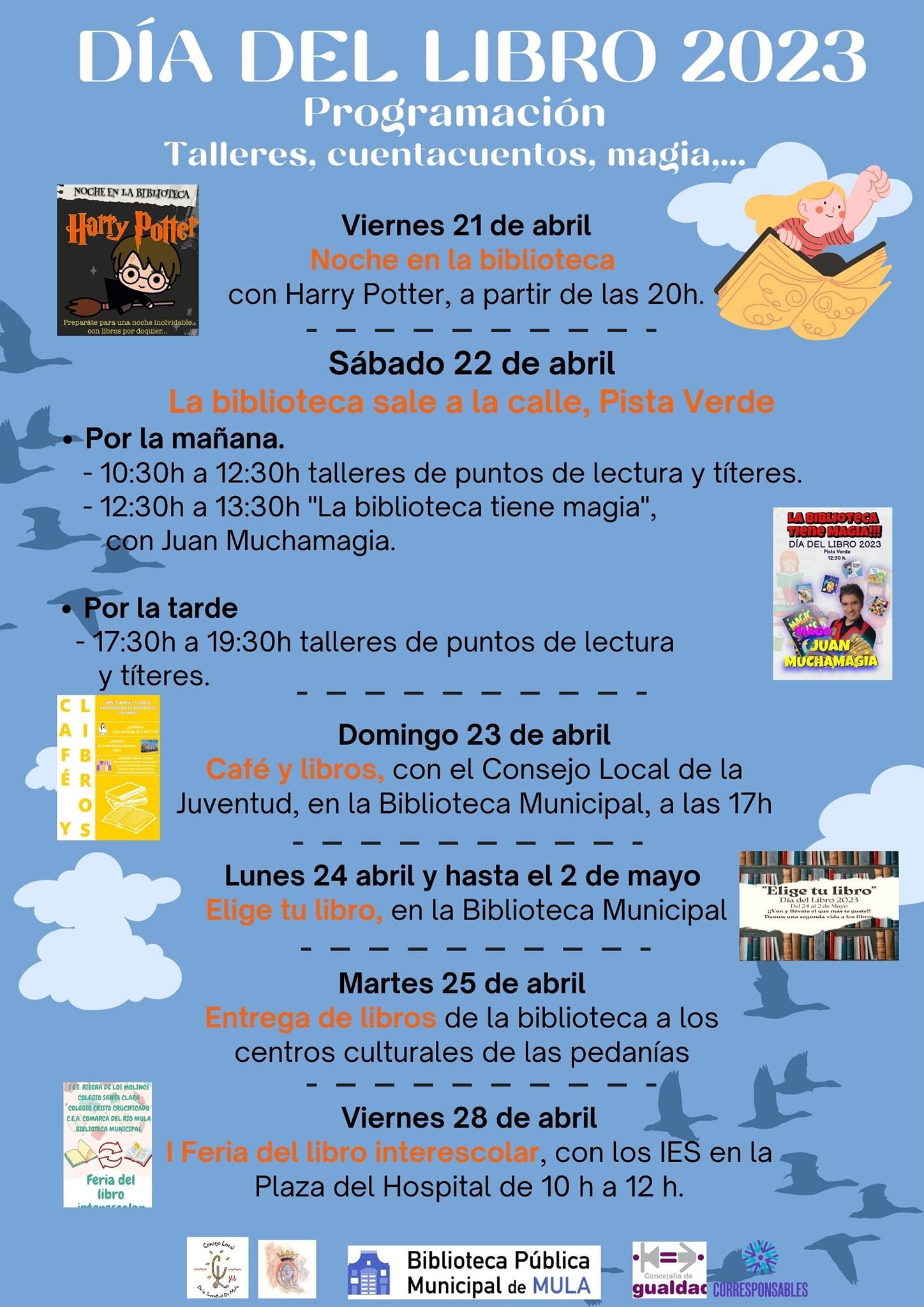 La Biblioteca Municipal de Mula, a través de la Concejalía de Cultura y en colaboración con la Concejalía de Igualdad y el Consejo Local de la Juventud, ha organizado una serie de actividades con motivo del Día Internacional del Libro, que se conmemora el domingo, 23 de abril.