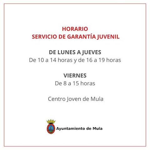 La Concejalía de Juventud y Adolescencia Mula informa de que se ha ampliado el horario de atención del servicio de Garantía Juvenil con el objetivo de ofrecer una mayor flexibilidad para que los jóvenes puedan beneficiarse del programa y sus recursos en el horario que más les convenga.DE LUNES A JUEVESDe 10 a 14 horas y de 16 a 19 horasVIERNESDe 8 a 15 horasCentro Joven