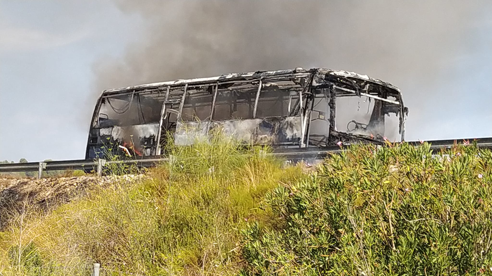 Informan que el autobús se encuentra completamente ardiendo y que sólo hay una persona fuera que no necesita asistencia sanitaria.