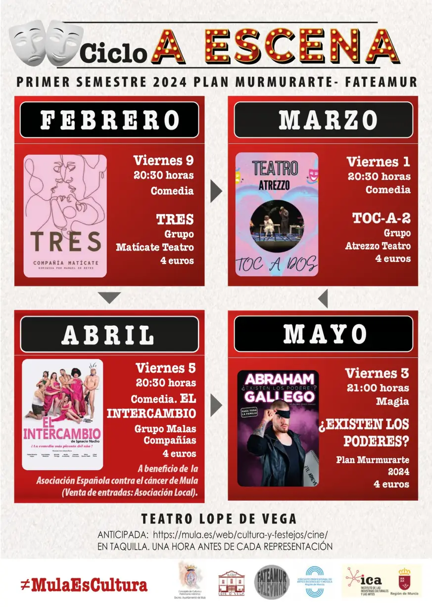 Las personas interesadas, pueden comprar desde ya las entradas de las obras teatrales que, a excepción de El intercambio, están disponibles en la web del Ayuntamiento de Mula por 4 euros: mula.es/web/cultura-y-festejos/cine/
