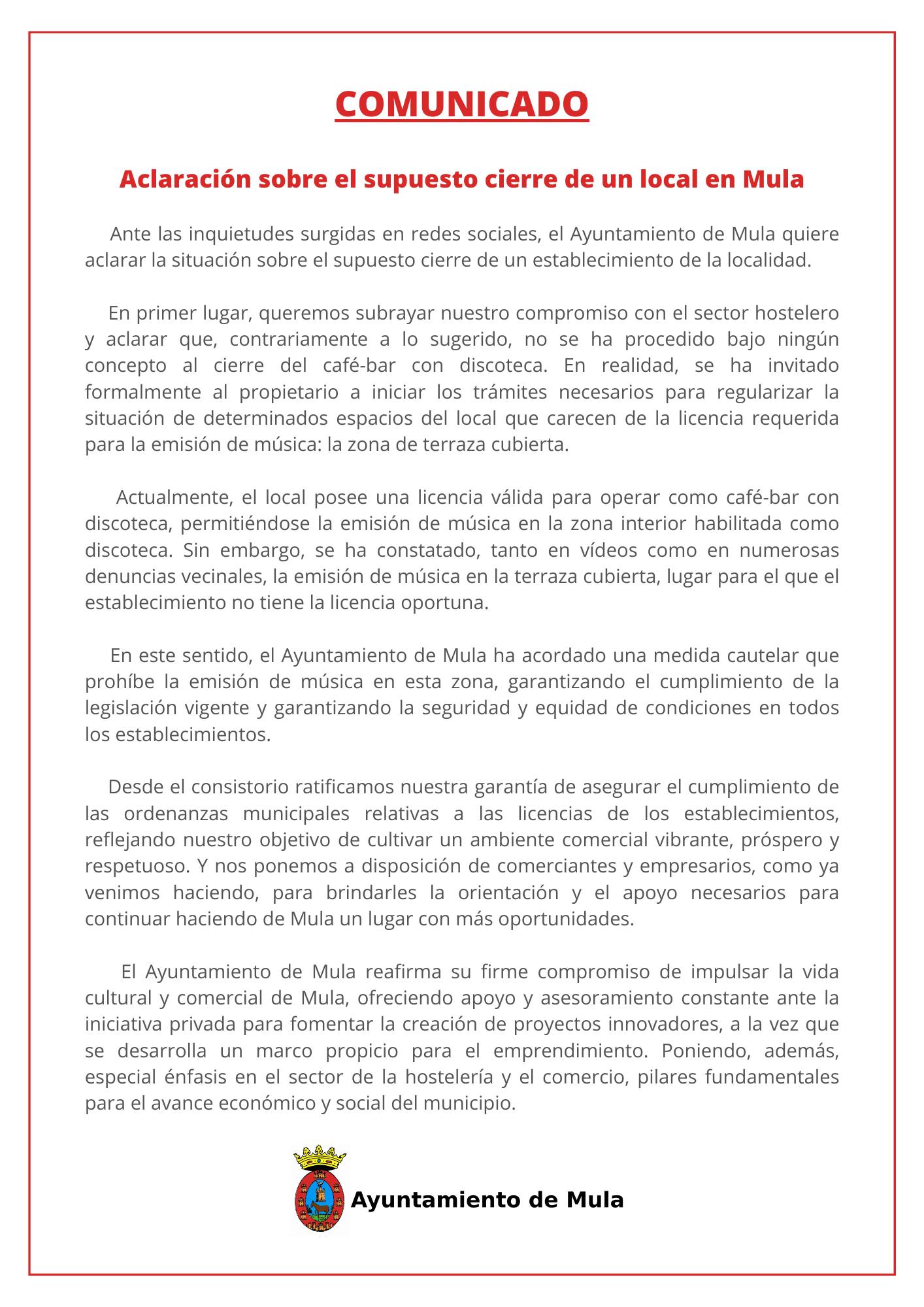 Comunicado: aclaración sobre el supuesto cierre de un local en Mula
