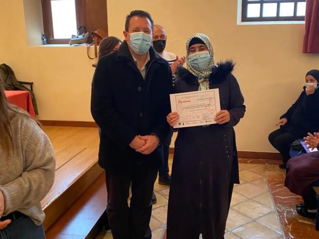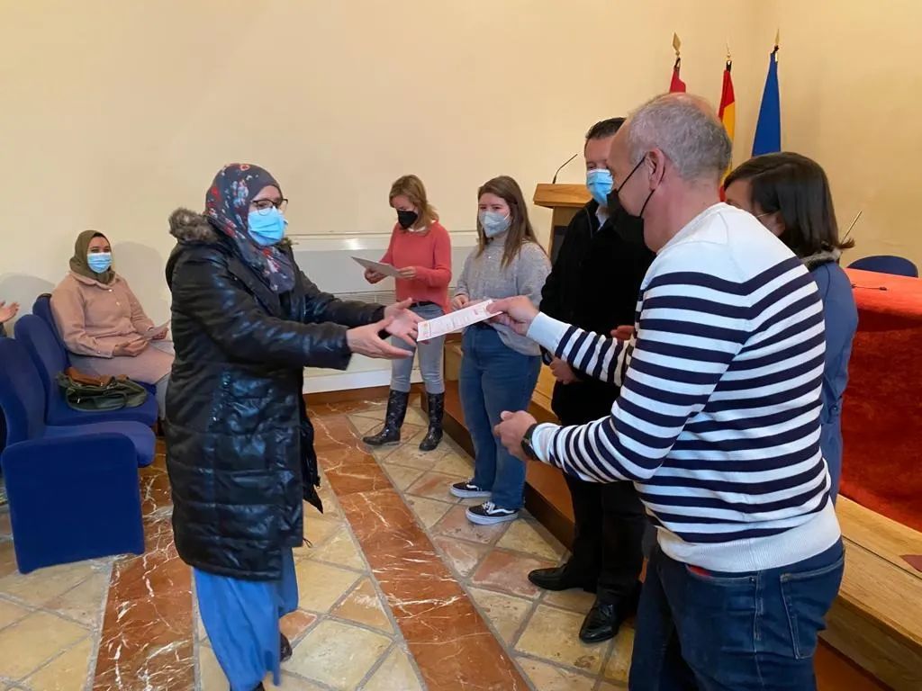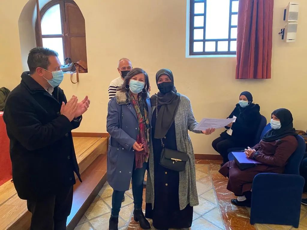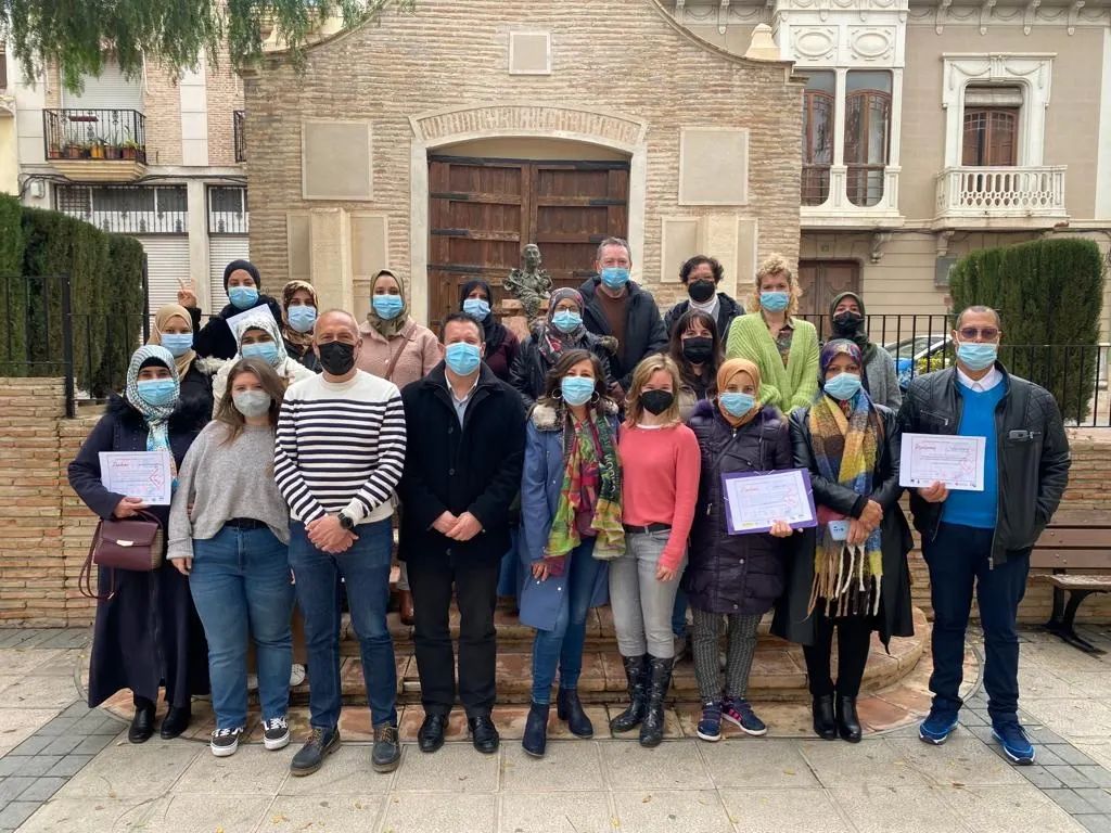 Mula 15 de marzo de 2022. El Alcalde de Mula, Juan Jesús Moreno, acompañado de la Concejal de Política Social, Antonia Gabarrón, y el Concejal de Desarrollo Local y Proyectos Estratégicos, Vicente López, ha asistido a la clausura de los talleres realizados por el Proyecto Camina Entre Telas, de la Asociación Proyecto Abraham, y el Proyecto Kairós. La clausura ha sido dirigida por la Coordinadora de formación y del Proyecto, Felicidad Cano, y Nuria Méndez, voluntaria europea. Al acto también han asistido el Agente de Desarrollo Local, Manolo Ibernón, la directora y dos técnicos de la Mancomunidad de Servicios Sociales Río Mula. Se han realizado dos talleres: Uno de español para extranjeros orientado a la actividad laboral de atención sociosanitaria, atención al cliente textil y confección (Proyecto Camina Entre Telas), y otro taller práctico de recursos comunitarios para mujeres extranjeras residentes en los barrios altos (Proyecto Kairós). El Proyecto Camina Entre Telas es un proyecto de empleabilidad englobado en el “Programa de inserción para el empleo, ProLaboral”, subvencionado por la Consejería de Mujer, Igualdad, LGTBI, Familias y Política Social, y los fondos de asignación tributaria de la casilla “La X Solidaria”. Es un servicio orientado a la mejora del acceso al empleo de las personas en situación de vulnerabilidad social. El Proyecto Kairós, liderado por la ciudad de Mula y participado por otras seis ciudades europeas, se centra específicamente en encontrar soluciones innovadoras para la regeneración de las áreas históricas degradadas, con un valioso patrimonio cultural y natural. Es un proyecto gestionado por el Programa URBACT y co-financiado por fondos FEDER.