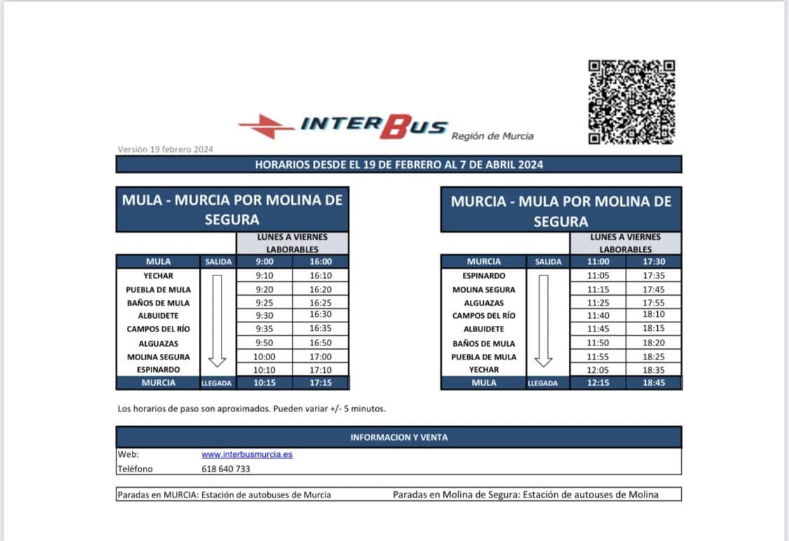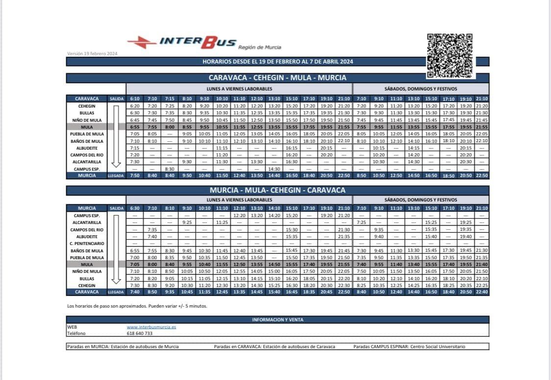 partir del próximo lunes 19 de febrero el servicio público de transporte de viajeros de las líneas Lorca-Murcia (MUR 043) y Caravaca-Murcia (MUR 025) dependientes de la Comunidad Autónoma de la Región de Murcia será realizado por la empresa INTERBUS.