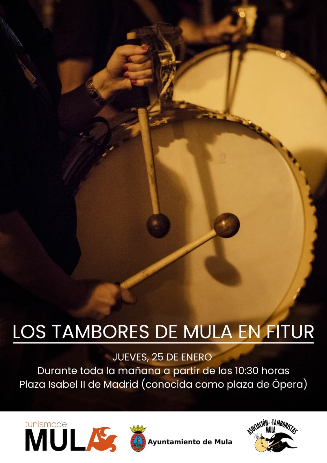 Nuestros tambores suenan en la Feria Internacional de Turismo de Madrid!Mañana jueves, 25 de enero, cinco tamboristas de la Asoc Tamboristas de Mula estarán en Madrid representando a nuestro municipio en FITUR, la feria más importante de turismo del mundo.Estarán tocando durante toda la mañana a partir de las 10:30 horas, en la plaza Isabel II, también conocida como plaza de Ópera.