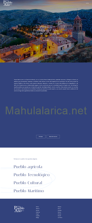 FASE 1: Presentación de candidaturas. Además de en la Región de Murcia, los premios se concederán en otras diez regiones: Aragón, Asturias, Illes Balears, Canarias, Catalunya, Comunidad Valenciana, Córdoba, Galicia, Málaga y Zamora. En cada comunidad autónoma se concederán cuatro categorías: Pueblo Agrícola del Año –también se tendrán en cuenta las iniciativas ganaderas–; Pueblo Marítimo del Año; Pueblo Tecnológico del Año –donde se considerarán proyectos tecnológicos y de digitalización– y Pueblo Cultural del Año –considerando cultura, arte y artesanía–.