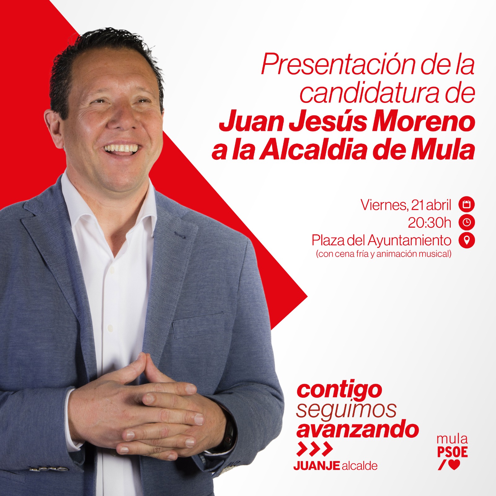 Este viernes 21 de Abril te esperamos en la Plaza el Ayuntamiento en el acto de presentación de la candidatura de Juanje a la alcaldía del Ayuntamiento de Mula.