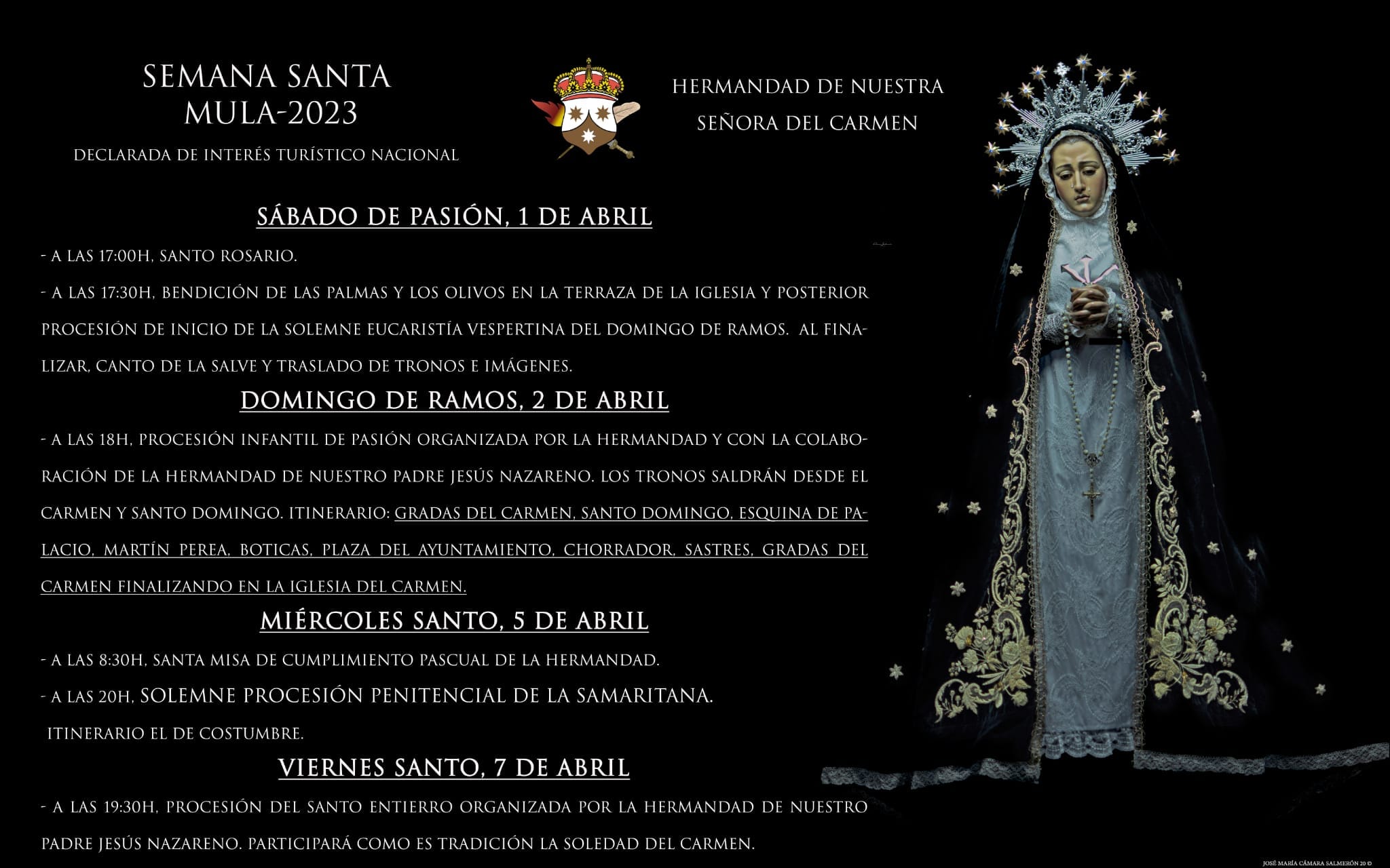 Semana Santa 2023 en la Ermita de Nuestra Señora del Carmen de la Ciudad de Mula. Artículo AnteriorPresentación de la revista de la Real e Ilustre Cofradía Jesús Resucitado de Mula nº18.Artículo SiguienteInauguración de la nueva sala de historia romana en Mula, en el Museo ciudad de Mula.TipografíaMás PequeñaPequeñaMedianaGrandeMás GrandePredeterminadaHelveticaSegoeGeorgiaTimesModo LecturaCompartir Artículo AnteriorPresentación de la revista de la Real e Ilustre Cofradía Jesús Resucitado de Mula nº18.Artículo SiguienteInauguración de la nueva sala de historia romana en Mula, en el Museo ciudad de Mula.