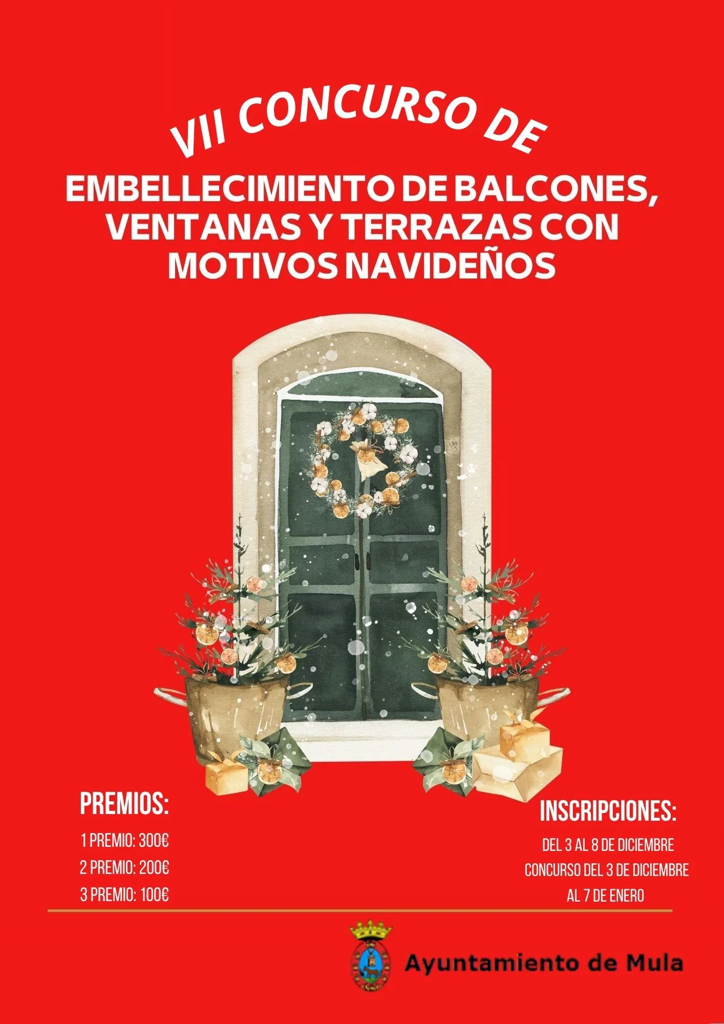 La concejalía de Festejos del Ayuntamiento de Mula convoca el VII Concurso de Embellecimiento de Balcones, Ventanas y Terrazas con Motivos Navideños, con el objetivo de realzar el encanto de nuestras calles y plazas durante las Fiestas de Navidad y Reyes.