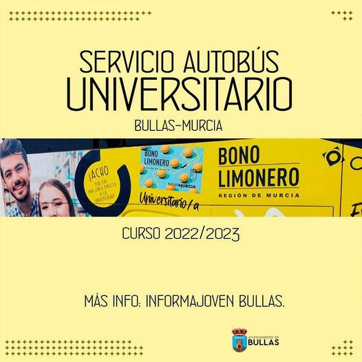 La Concejalía de Educación y Juventud del Ayuntamiento de Bullas ha informado que ya se puede solicitar el Bono de Transporte Universitario para el curso académico 2022/2023.