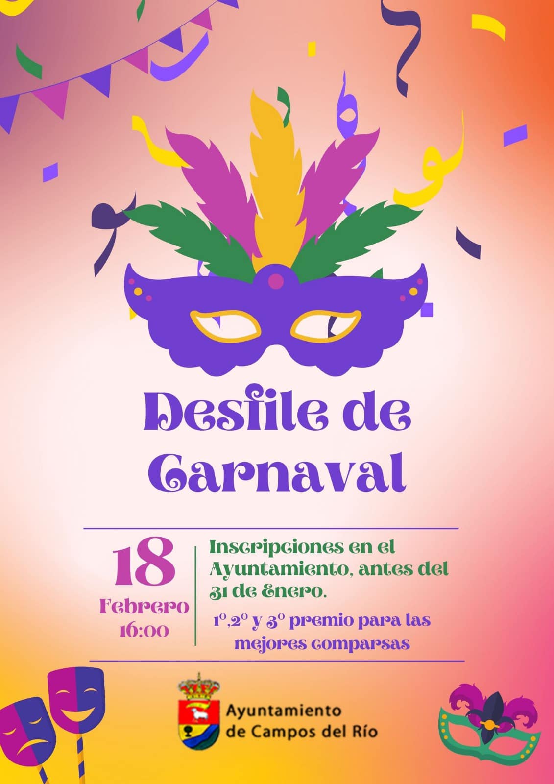 El próximo 18 de febrero a las 16.00 horas se celebra en Campos del Río el gran desfile de Carnaval 2024.Todos los grupos y comparsas que participen en el desfile deberán inscribirse en el Ayuntamiento antes del 31 de enero con el fin de poder organizar la actividad.Habrá premios para las tres mejores comparsas!!Carnaval 2024!!Fuente:Ayuntamiento de Campos del Rio.