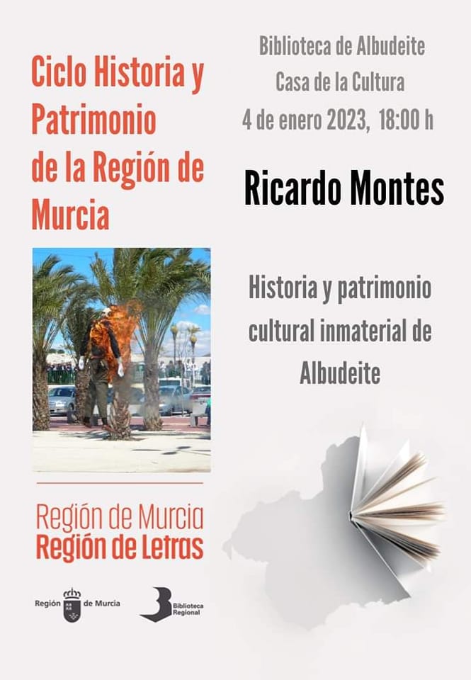 El próximo 4 de enero tendrá lugar en la Biblioteca de Albudeite la charla coloquio "Historia y patrimonio cultural inmaterial de Albudeite". A cargo de Rircardo Montes Historiador y Cronista oficial de Albudeite. Y dentro del Ciclo Historia y Patrimonio de la Región de Murcia, promovido por la Red Bibliotecas Región Murcia.