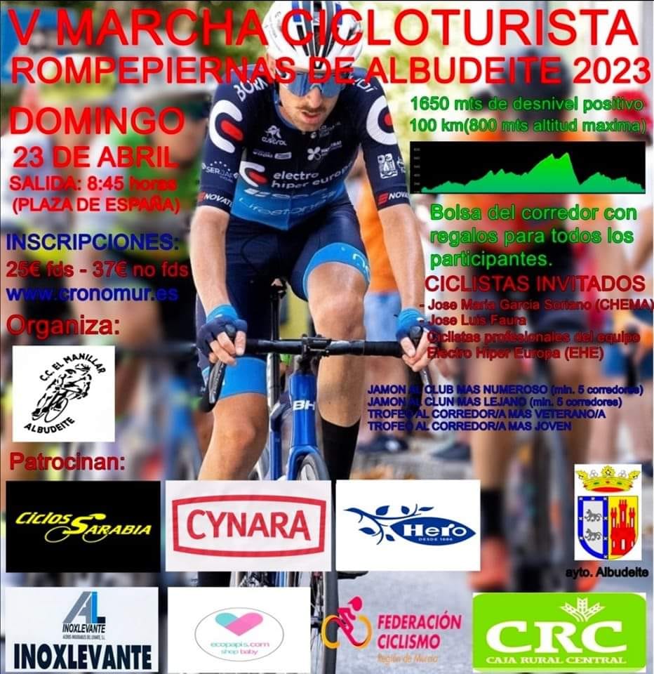 Ya queda poquito para V MARCHA CICLOTURISTA DE ALBUDEITE. Recordar que las inscripciones siguen abiertas en cronomur. El próximo Domingo cita deportiva en Albudeite. Organiza el Club Ciclista El Manillar