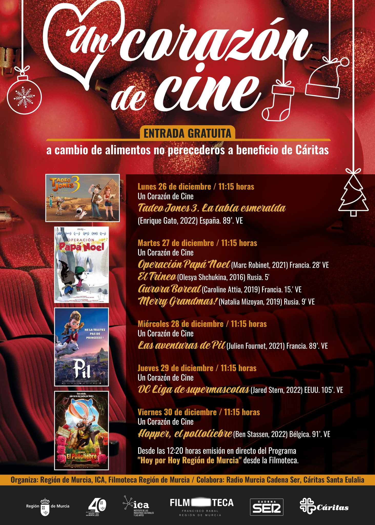 “Ahora, aprovechamos estas fechas de Navidad para ofrecer títulos en pantalla grande, que se pueden disfrutar en familia, al mismo tiempo que se lleva a cabo una labor social para compartir alimentos con miles de familias de la Región que necesitan nuestra ayuda”, añadió Ortuño.