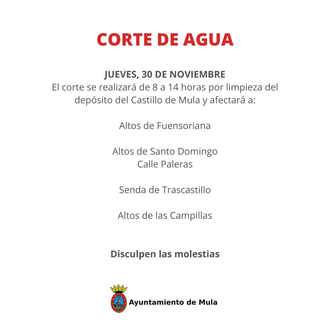 Aviso de corte de agua para el jueves 30 de noviembre en Mula