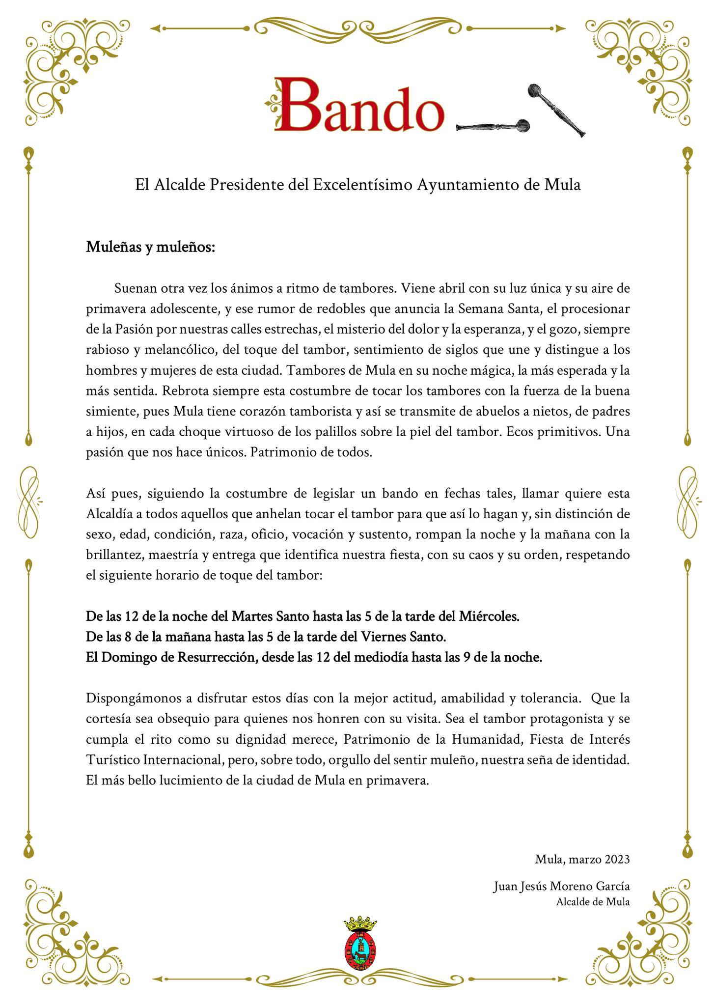 Bando del horario de toque del tambor Fiesta de los Tambores 2023 Bando del horario de toque del tambor Fiesta de los Tambores 2023 Reading Mode aA aA Smaller Font Bigger Font Share This Previous Article El Alcade Mula junto a López Miras visita las nuevas instalaciones de la empresa PSB Producción Vegetal. Next Article Mula clausura el XIX Congreso Internacional de Turismo Religioso y Sostenible. Ciudad de Mula Noche de los Tambores