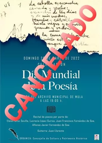 (CANCELADO)Recital de Poesía con motivo del Día Mundial de la Poesía. (CANCELADO)Recital de Poesía con motivo del Día Mundial de la Poesía. Modo de Lectura aA aA Fuente Más Pequeña Fuente Más Grande Compartir Esto Artículo Anterior ORDENANZA REGULADORA DE LA TASA POR LA REALIZACIÓN DE LA ACTIVIDAD ADMINISTRATIVA DE EXPEDICIÓN DE DOCUMENTOS ADMINSTRATIVOS Artículo Siguiente El museo "Ciudad de Mula", del convento de San Francisco, acoge la exposición sobre el Carnaval de Mula Mula