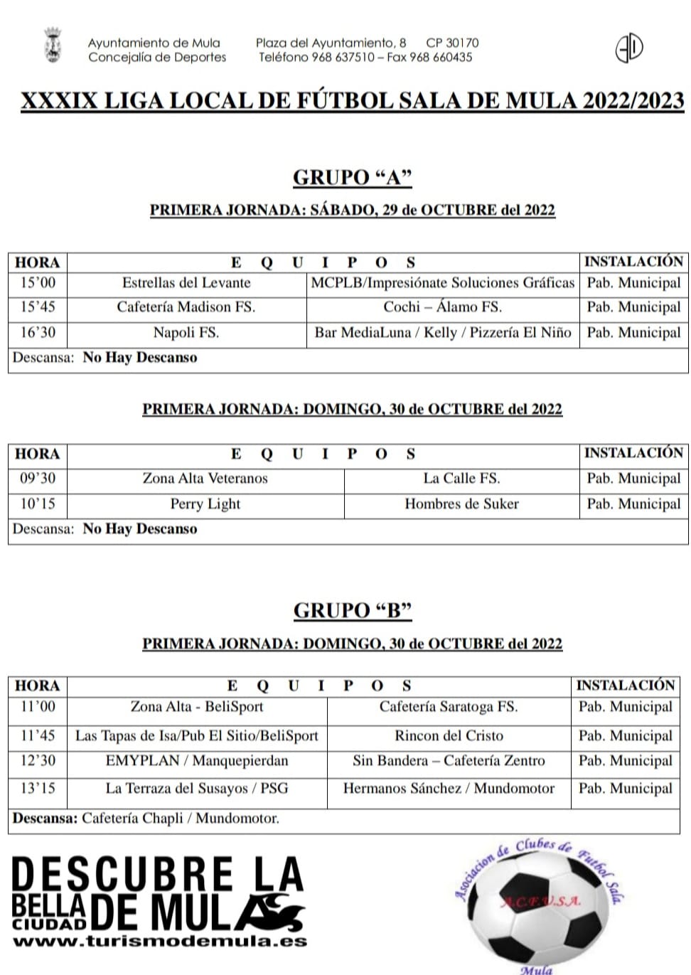 Esta liga de fútbol, que goza de gran relevancia a nivel regional, vuelve despuésde haberse paralizado por la pandemia de Covid-19. Los partidos se disputaránentre el Pabellón Municipal y el Pabellón Javi García de Mula, a lo largo de una temporada que tiene previsto finalizar a principios de mayo de 2023. El accesocomo público a los encuentros es totalmente libre.