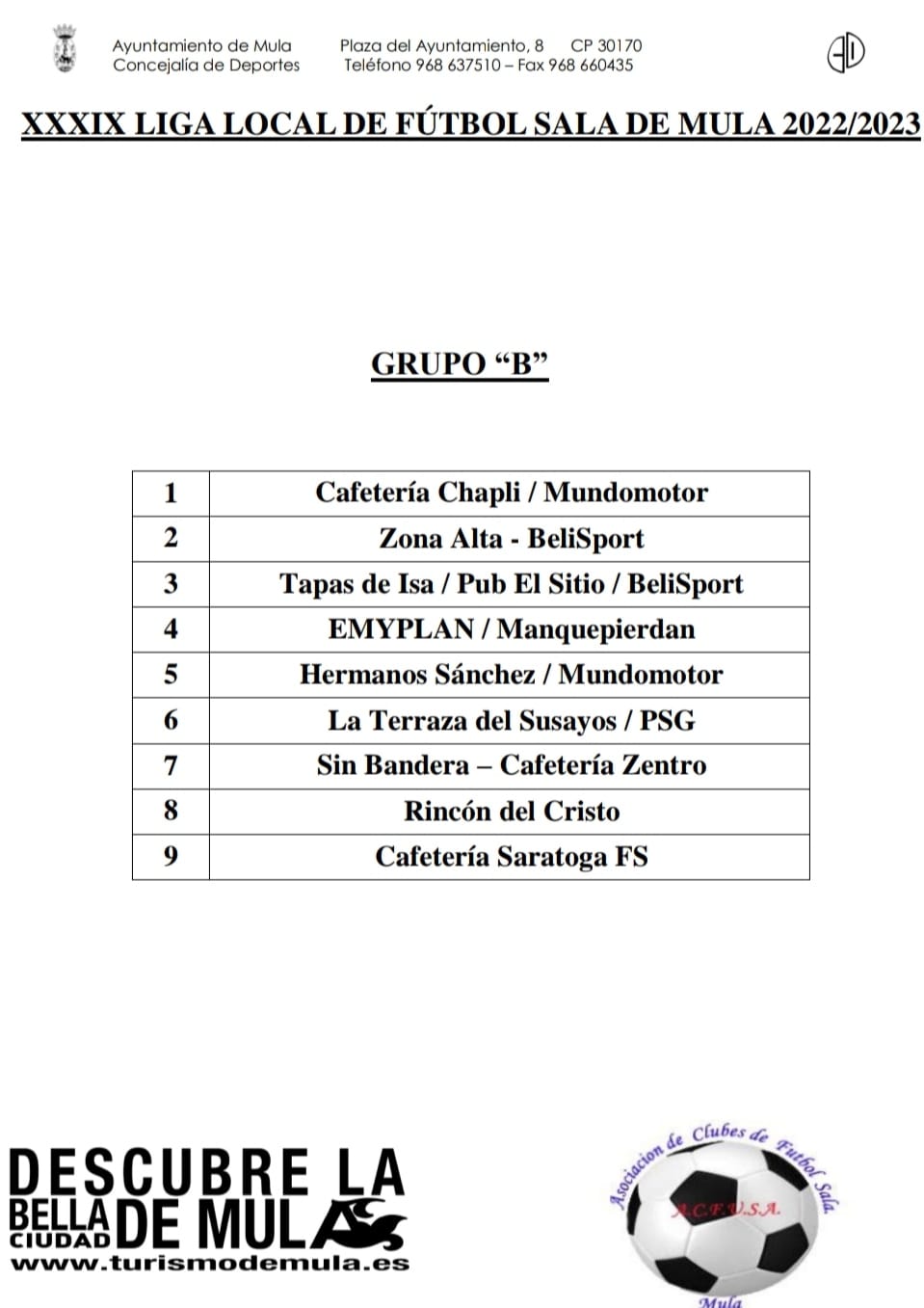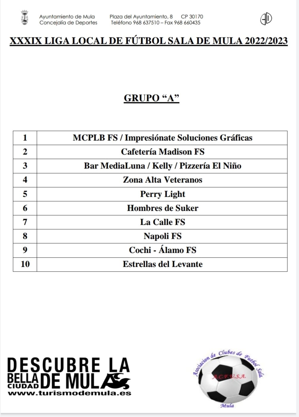 Este año en la competición participan 19 equipos, que se han dividido en dos grupos, A y B, de los que se formará la Primera y Segunda División para la edición2023-2024. El sorteo del calendario se realizó el jueves, 27 de octubre en el Archivo Municipal y contó con la participación de miembros de la Concejalía de Deportes delAyuntamiento de Mula y la Asociación de Club de Fútbol Sala de Mula (ACFUSA).