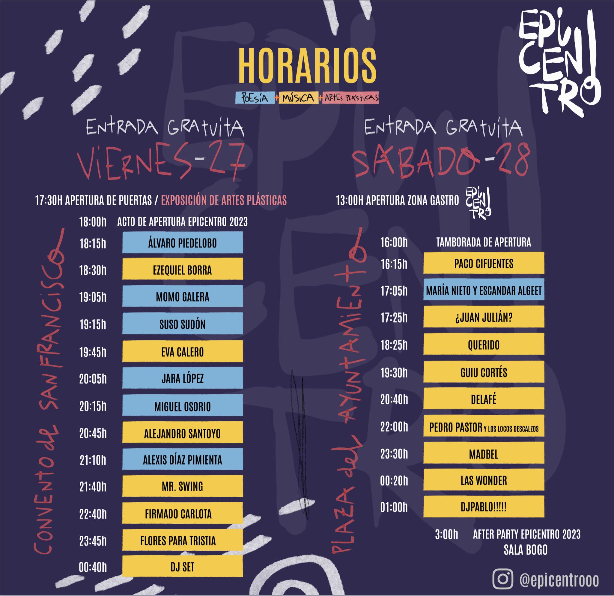 El Festival Epicentro se celebrará en Mula el ultimo fin de semana de octubre. El Festival Epicentro se celebrará en Mula el ultimo fin de semana de octubre. Modo de Lectura aA aA Fuente Más Pequeña Fuente Más Grande Compartir Esto El Festival Epicentro se celebrará en Mula el fin de semana de octubre, viernes 27 (Convento de San Francisco) y sábado 28 (plaza del Ayuntamiento). La entrada es gratuita. Esta es la programación y horarios. Artículo Anterior El Ayuntamiento de Mula aprueba el interés público para construir bungalows turísticos en Casas Nuevas. Artículo Siguiente MULASPORT EN LA MILLA POPULAR DE PUERTO LUMBRERAS 2023
