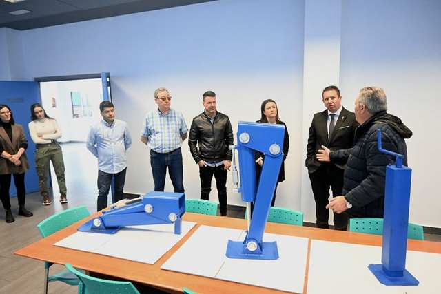 El alcalde de Mula Juan Jesús Moreno, acompañado por la concejal de Hacienda y economía, Alejandra Martínez, ha conocido del presidente de la empresa "Estampaciones Metálicas La Muleña", Felipe Ramírez, esta nueva innovación tecnológica muleña que está arrasando en el mundo agrícola a nivel internacional.