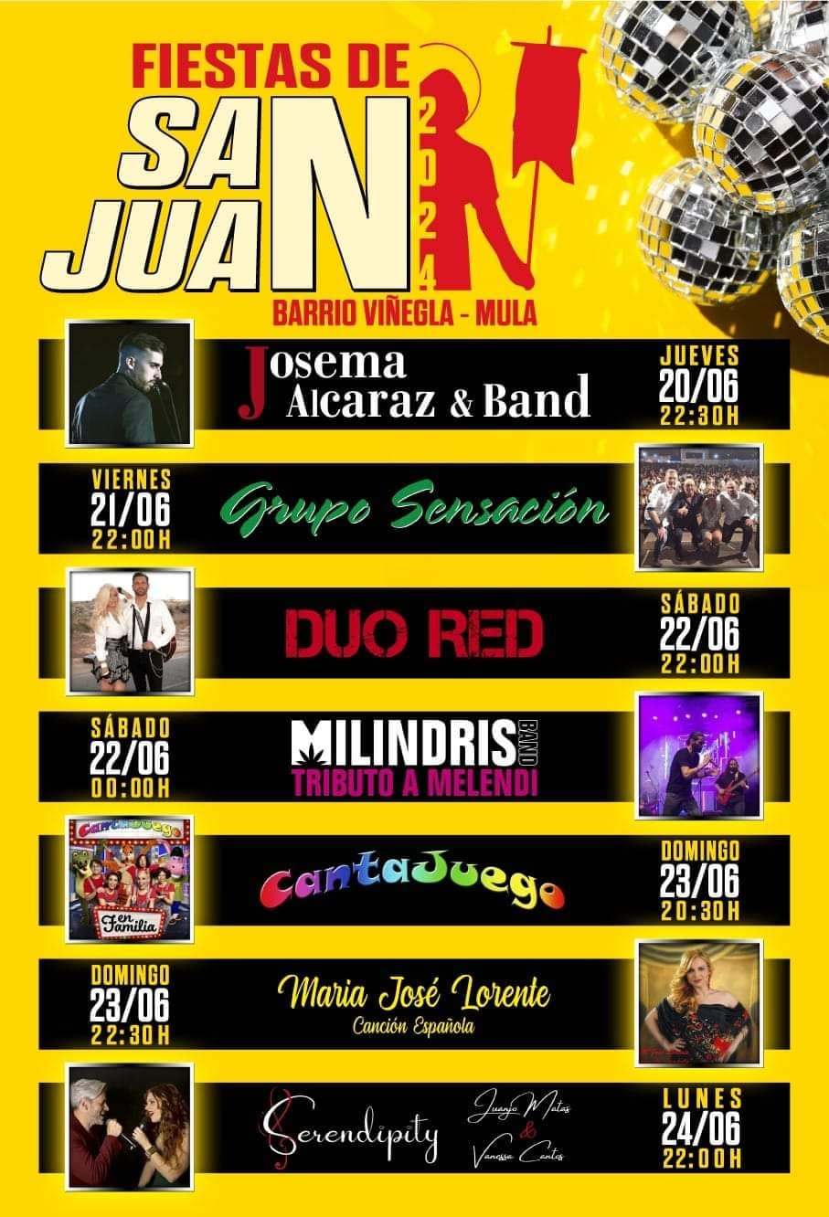 - Lunes 24 de junio: A las 20:30 horas se llevará a cabo la procesión con la imagen de San Juan por el recorrido de costumbre, acompañada por la Peña Alegría Muleña. A las 21:00 horas Santa Misa en el Parque de la Milagrosa, con la participación de la Peña Alegría Muleña. Actuación de Serendipity a las 22:00 horas. El disparo de la traca fin de fiestas será a las 00:00.