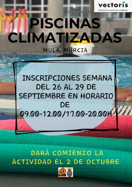 Tras la temporada veraniega, Mula abre el nuevo curso en las piscinas climatizadas, a las que los interesados pueden inscribirse del 26 al 29 de septiembre, en horario de 9 a 12 horas y de 17 a 20 horas en las propias instalaciones, situadas en la avenida de la Paz, junto al Polideportivo Municipal. Las actividades darán inicio el lunes, 2 de octubre.