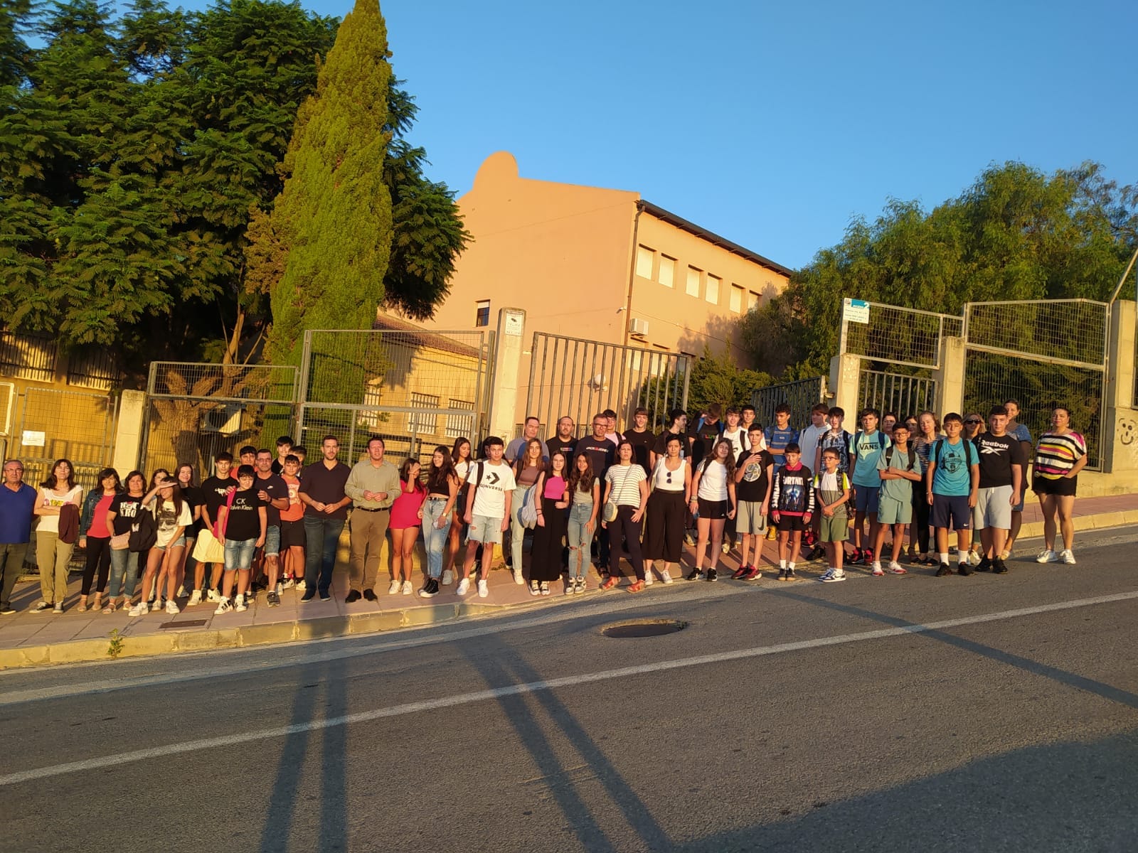 Esta mañana, el alcalde de Mula, Juan Jesús Moreno, y el concejal de Educación, Diego Boluda, se han manifestado junto a los alumnos y alumnas del IES Ribera de los Molinos de Mula y sus familias debido al desamparo de la Consejería de Educación ante la falta de transporte escolar.