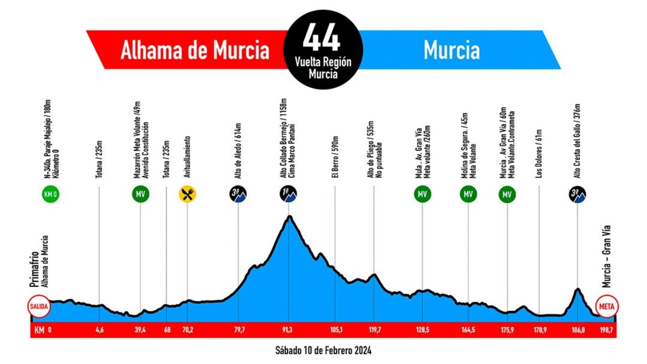La Vuelta a la Región de Murcia 2024 está a la vuelta de la esquina. La carrera se celebrará el próximo sábado 10 de febrero, con salida en la sede de Primafrío en Alhama de Murcia, y finalizará en Murcia, cubriendo un total de 199 kilómetros. Los ciclistas tendrán que enfrentarse a tres altos: Alto de Aledo, Collado Bermejo - Cima Marco Pantani y Cresta del Gallo. Además, habrá cuatro metas volantes en las localidades de Mazarrón, Mula, Molina de Segura y Murcia.