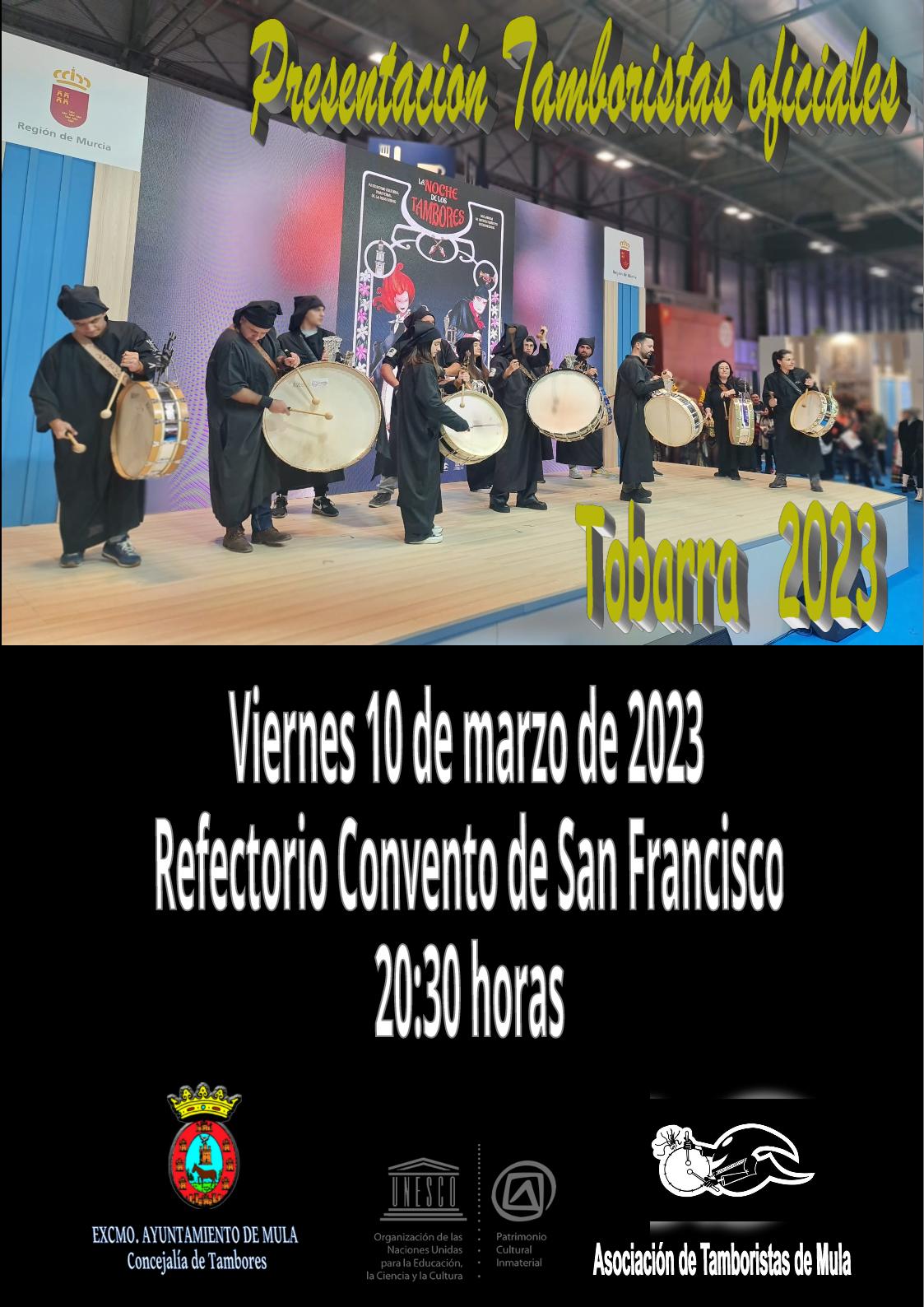 El viernes, 10 de marzo, la Concejalía de Tambores y la Asociación de Tamboristas de Mula realizarán la presentación de los tamboristas oficiales que estarán representando a nuestra bella ciudad en las Jornadas Nacionales del Tambor y del Bombo de Tobarra 2023.