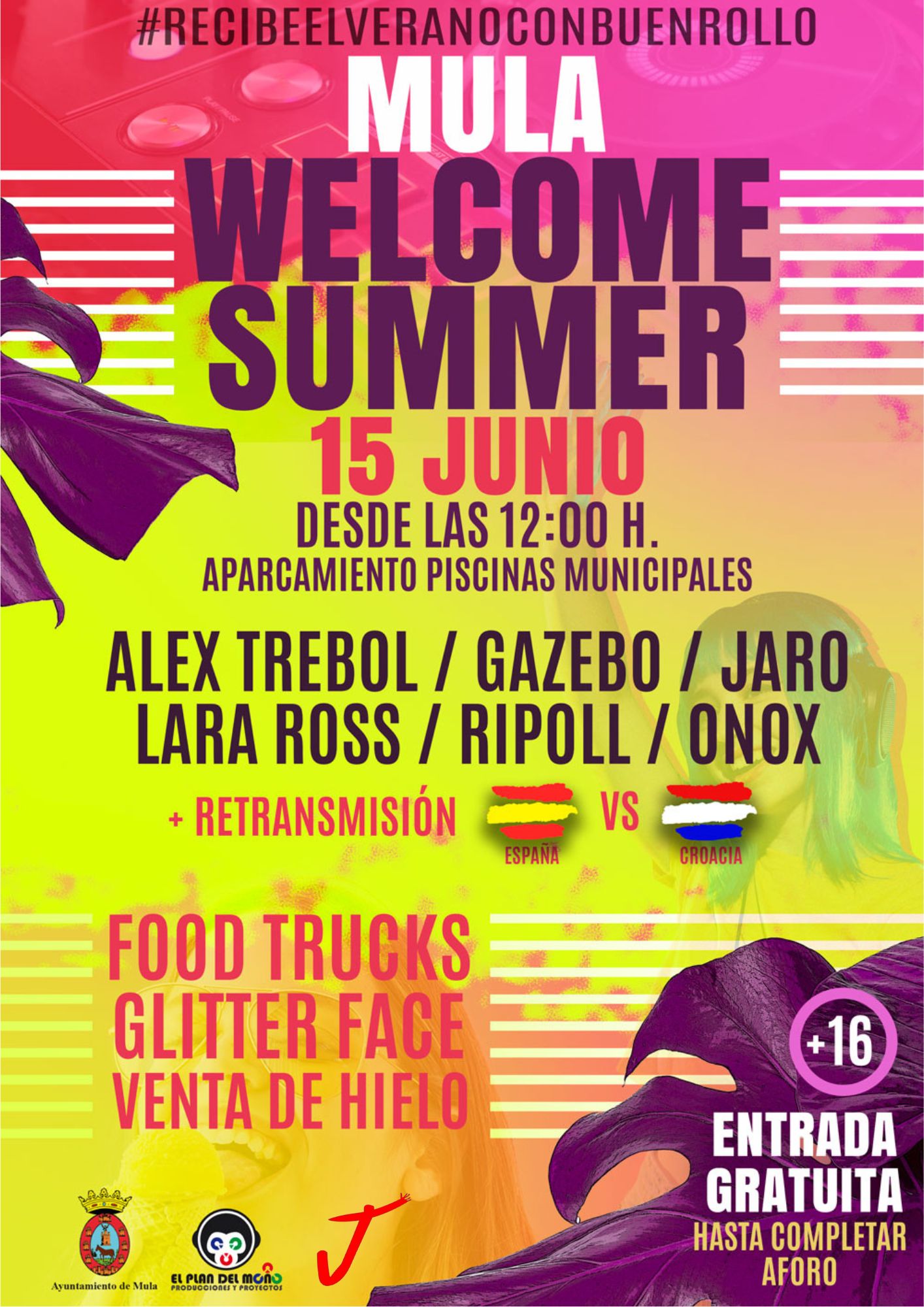 El Ayuntamiento de Mula, a través de la concejalía de Juventud, y en colaboración con El Plan del Mono, presenta el festival "Mula Welcome Summer", que tendrá lugar el próximo 15 de junio a partir de las 12:00 horas en el aparcamiento de las piscinas municipales de Mula para los mayores de 16 años.