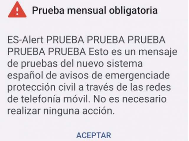 - Sonará un pitido con el máximo volumen del teléfono.- El teléfono vibrará durante unos segundos.- El mensaje de alerta se mostrará ocupando toda la pantalla hasta que sea reconocido (pulsando “Aceptar”) por el ciudadano. Además, los teléfonos que lo permitan, y que hayan sido configurados para ello, generarán una locución con el texto del mensaje.Durante unos minutos, cualquier teléfono móvil que entre en la Región de Murcia recibirá la alerta de prueba.Con este sistema de alerta se pretende asegurar la difusión de las alertas a gran parte de la población que pueda verse afectada por emergencias graves derivadas de fenómenos meteorológicos, sísmicos, inundaciones, deslizamientos de tierra, incendios forestales o urbanos, accidentes industriales, etc.