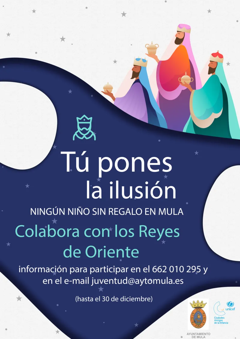 Deberás entregar tu regalo en la Concejalía de Juventud y Adolescencia (Espacio M), en horario de mañanas de 8 a 14 horas, de lunes a viernes, hasta el día 30 de diciembre. Gracias a tu colaboración, los niños y niñas de Mula podrán recibir sus deseados regalos y vivir esta Navidad con ilusión, esperanza y alegría. Y tú volverás a sentir la magia de esa fecha tan especial, como ayudante de los Reyes Magos.
