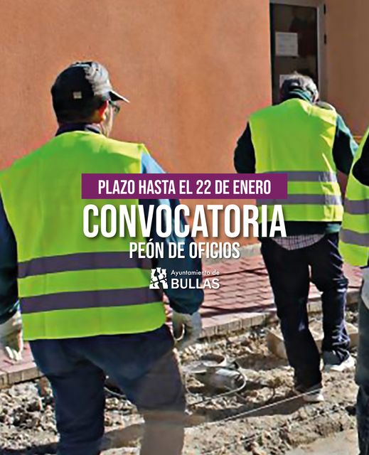 La Concejalía de Servicios Públicos del Ayuntamiento de Bullas comunica la apertura del periodo de solicitud para participar en el proceso de selección de 2 plazas de peón de oficios, a través de concurso oposición libre.