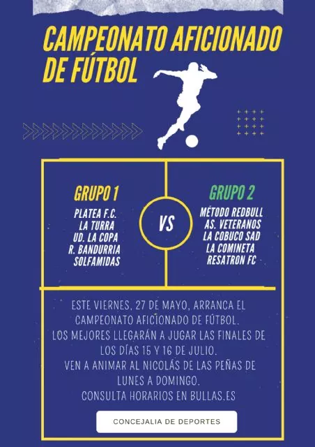 En cuanto a los equipos inscritos, en el grupo 1 nos encontramos con Platea F.C., La Turra, UD. La Copa, R. Bandurria y Solfamidas. Mientras, en el grupo 2, se encuentran Método Redbull, As. Veteranos, La Cobuco Sad, La Comineta y Resatron FC.