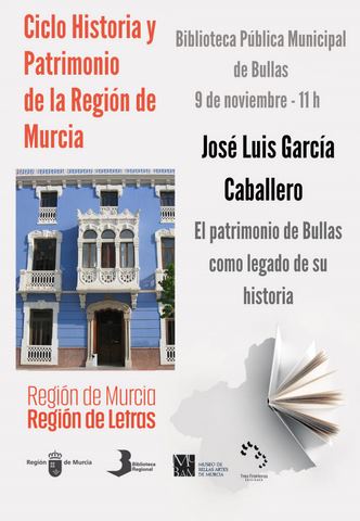 José Luis García Caballero hablará sobre el rico patrimonio de Bullas dentro del ciclo Historia y Patrimonio de la Región que organizan desde la Dirección General de Patrimonio Cultural de la CARM y que, además, coincide con la celebración el próximo fin de semana de las VI Jornadas de Historia y Patrimonio de Bullas promovidas por el Ayuntamiento de Bullas.Licenciado en Geografía e Historia por la Universidad de Murcia y diplomado en Biblioteconomía y Documentación. Actualmente trabaja como técnico de turismo y patrimonio del Ayuntamiento de Bullas. En su dilatada trayectoria como historiador ha puesto en valor el patrimonio material e inmaterial de Bullas divulgando su historia y sus tradiciones: la torre del reloj, la ermita de San Blas, la casa de don Pepe Marsilla, la iglesia parroquial de Nuestra señora del Rosario.
