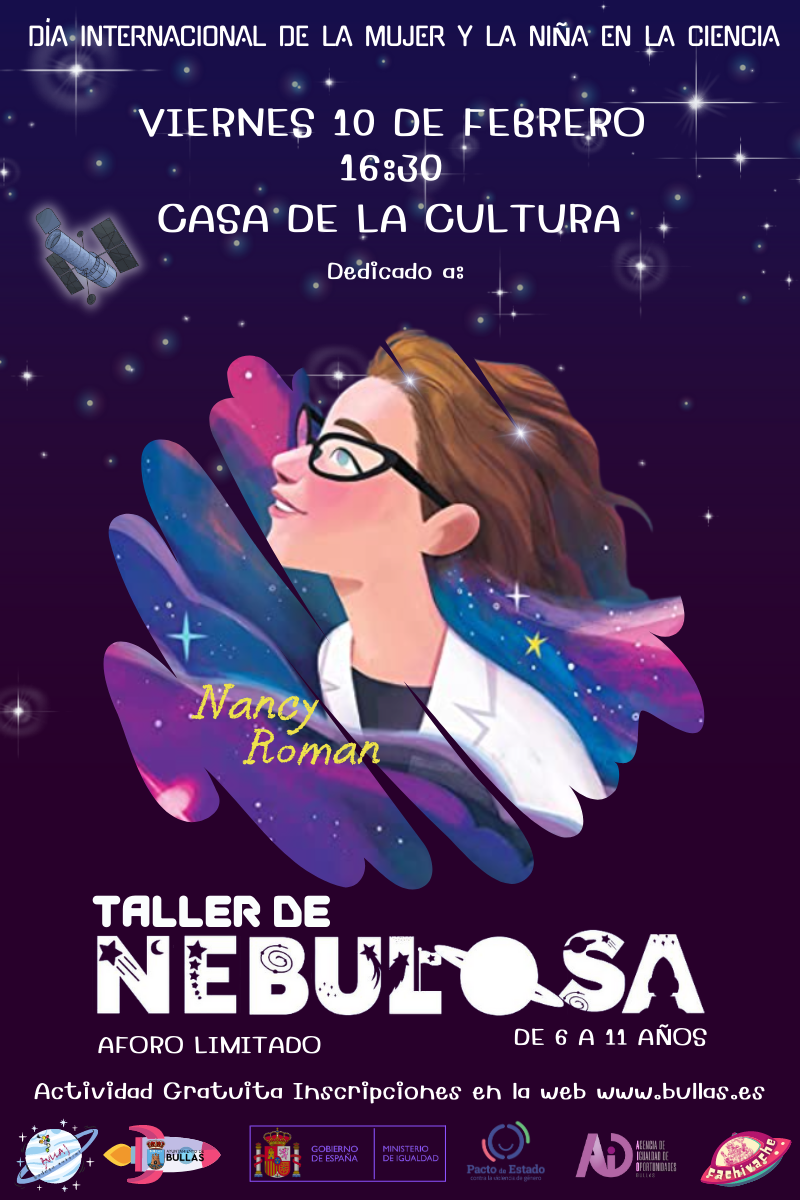 Ese mismo día, a las 16:30 horas en la Casa de la Cultura, la Asociación Sociocultural Cachivache realizará, para menores de 6 a 11 años, el taller "Como crear una nebulosa en un frasco", dedicado a Nancy Roman. La actividad es gratuita, financiada con cargo a los créditos recibidos del Ministerio de Igualdad, Secretaría de Estado de Igualdad y Contra la Violencia de Género. El aforo es limitado, siendo necesaria inscripción previa en www.bullas.es.