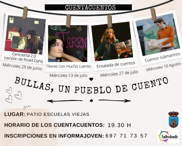 Los días 29 de junio, 13 de julio, 27 de julio y 10 de agosto a las 19.30 horas se celebrarán cuentacuentos con diferentes protagonistas que harán las delicias de pequeños y mayores. Así, tendremos la historia 2.0 de Cenicienta, títeres con mucho cuento, ensalada de cuentos y cuentos submarinos durante cuatro miércoles de verano.