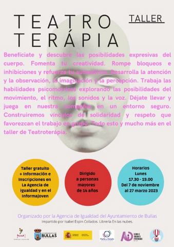 La Agencia de Igualdad del Ayuntamiento de Bullas, a través de la Concejalía de Igualdad, ha organizado un taller gratuito de Teatro Terapia que será impartido por Isabel Espín Collados.