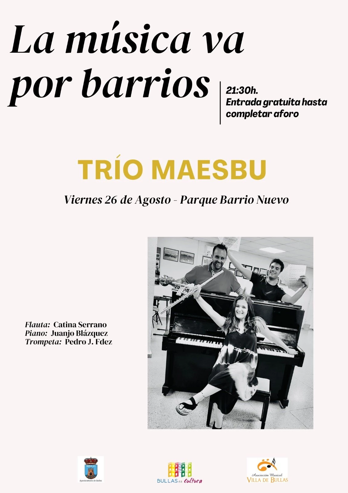 BULLAS - La Musica va por Barrios- Trío Maesbu BULLAS - La Musica va por Barrios- Trío Maesbu Modo de Lectura aA aA Fuente Más Pequeña Fuente Más Grande Compartir Esto Este viernes podremos ver al Trío Maesbu en el ciclo 'La música va por barrios'. A partir de las 21.30 horas en el parque del Barrio Nuevo. Entrada gratuita. Artículo Anterior BULLAS- Ya se puede solicitar el Bono Trasporte Universitario Artículo Siguiente BULLAS- LA COPA CALIENTA MOTORES DE CARA A SUS FIESTAS PATRONALES Bullas Musica