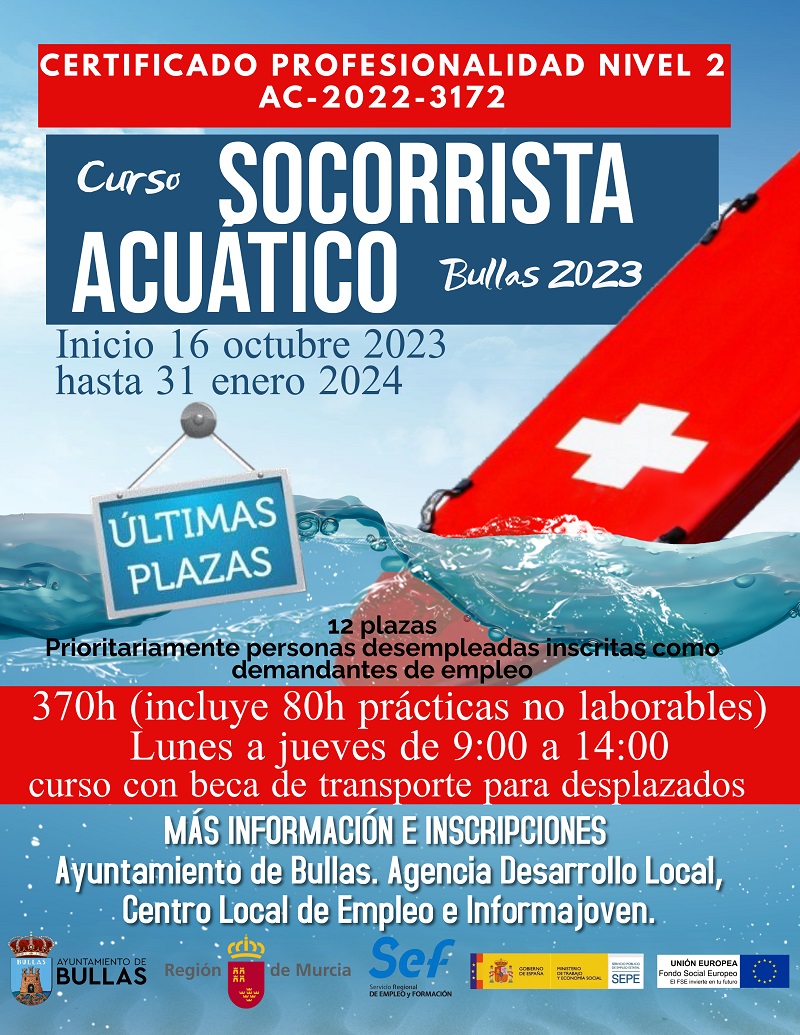 Organizado por la Concejalías de Desarrollo Local del Ayuntamiento de Bullas, en colaboración con el Servicio Regional de Empleo y Formación, se va a realizar un Curso, totalmente gratuito, de “Socorrismo en instalaciones acuáticas”, dirigido prioritariamente a personas desempleadas inscritas en el SEF.