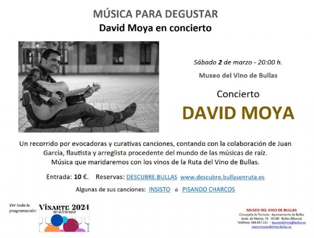 El cantautor ofrece un recorrido por evocadoras y curativas canciones y contará con la colaboración de Juan García, flautista y arreglista procedente del mundo de las músicas de raíz. "Canto para llenar el pecho de aire y devolverlo al ambiente cargado de emociones, de historias vitales y veraces" manifiesta en la descripción que hace de él en su web davidmoya.net.