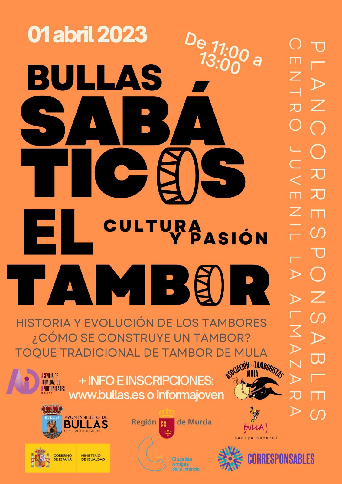 El tambor, cultura y pasión, será la temática sobre la que versará el próximo ‘Sábado Sabático’ enmarcado en el Plan Corresponsables y dirigido a menores de entre 3 y 12 años que, en esta ocasión, tratará sobre la historia y evolución de los tambores. Los asistentes aprenderán cómo se construye un tambor y el toque tradicional del tambor de Mula.