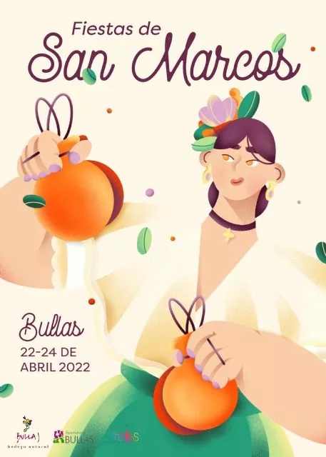 En dicho cartel figura la leyenda: "Fiestas de San Marcos. Bullas. Del 22 al 24 de abril", tal y como se recogía en las bases del concurso, y, además, la ilustradora ha recurrido al dibujo de una huertana tocando las castañuelas en tonos amables y primaverales.