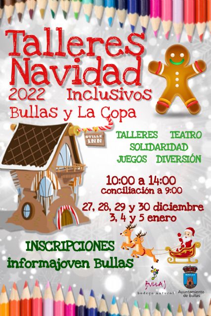 El Ayuntamiento de Bullas abre el plazo para inscribirse tanto en la Escuela Municipal de Navidad de Bullas como en la de La Copa que estarán operativas los días 27, 28, 29 y 30 de diciembre y 3, 4 y 5 de enero.