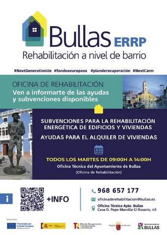 La Oficina de Rehabilitación del Ayuntamiento de Bullas nace de la necesidad de acercar, informar y asesorar a los ciudadanos del municipio de las diferentes ayudas recibidas desde Europa para la rehabilitación de edificios y viviendas, financiadas a través de los fondos Next Generation, con el fin de ser una herramienta al alcance de todos los bulleros y bulleras.