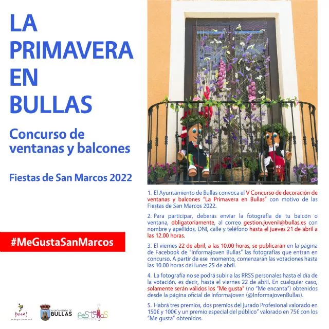 Con motivo de la celebración de las Fiestas de San Marcos 2022, la Concejalía de Festejos del Ayuntamiento de Bullas, convoca el V Concurso de engalanamiento de balcones y ventanas 'La primavera en Bullas'.