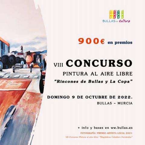 La Concejalía de Cultura del Ayuntamiento de Bullas, convoca el VIII Concurso de Pintura al Aire libre "Rincones y paisajes de Bullas y La Copa" con el que pretende fomentar la actividad creadora, animar a la participación artística de los ciudadanos y de las ciudadanas, difundir y dar a conocer artistas o aficionados.